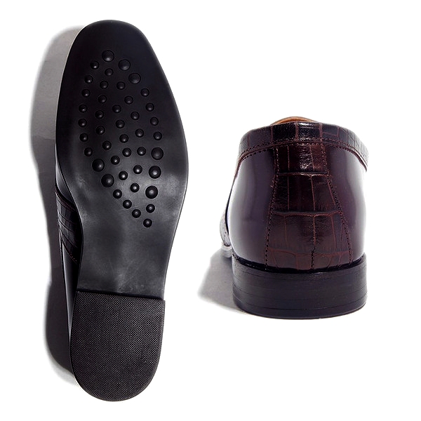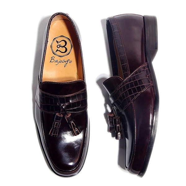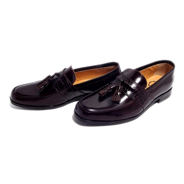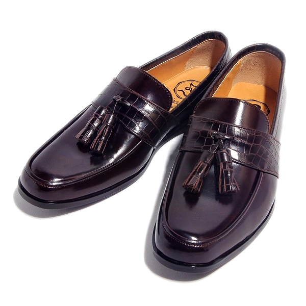 | 今回ご紹介するのは、しっかりした厚みのあるレザーにムラ染めされた表面は、みて分かるとおり大人の雰囲気を抜群に醸し出す。足元に存在感を与えてくれるタッセルは、毎日手が伸びそうなヘビロテアイテムで間違いなし!色はムラ染めダークブラウン×クロコダイル型押しダークブラウン。パーティーシーンに持ち出してもOK! | ||||||||||||||||||||||||||||||||||||