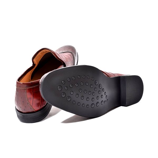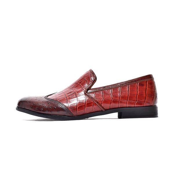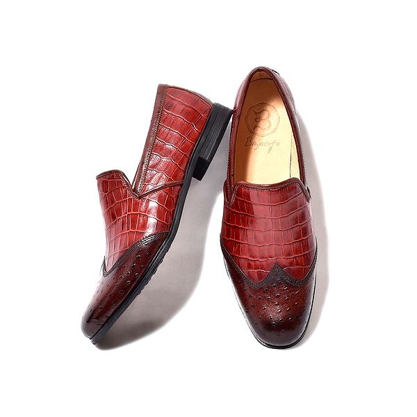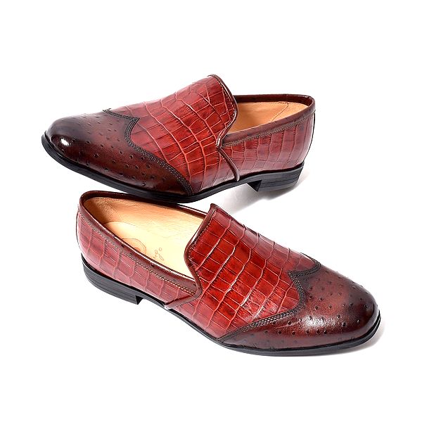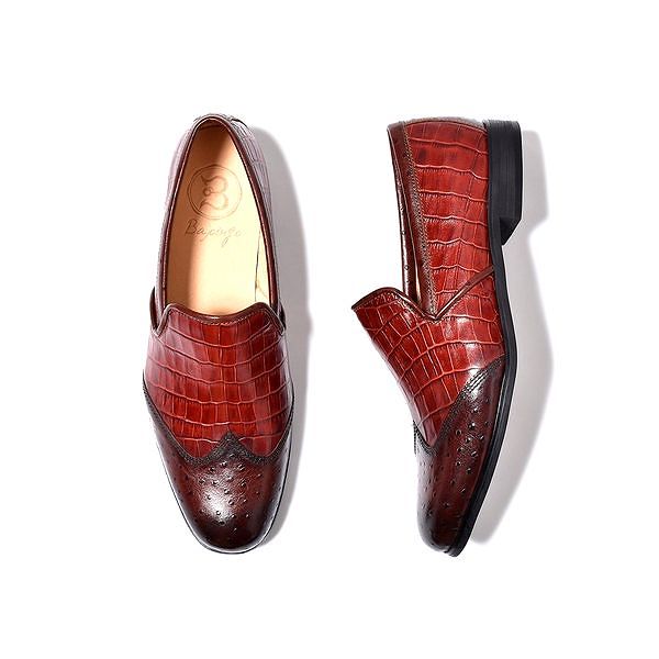 | 今回ご紹介するのは、一味も二味もあるウィングチップのスリッポン。クロコダイル&オーストリッチの模様を型押しした国産天然牛革を使用。相違した模様を茶系で揃える事で見事に統一感を持たせた。そんなエンボスレザーを纏ったスリッポンは、パーティーシーンなどでも活躍できる華やかでゴージャスな面持ち。また、職人の手作業で専用クリームを何層にも塗り重ね、アンティーク仕上げを施し色の深みと高級感も兼ね備えた。見た目はフォーマルだが高いクッション性を誇り、長時間歩いても足に負担を掛けないシューズだ。インソールには低反発クッションスポンジ、アウトソールにはラバーソールを採用する事で柔らかな履き心地を実現。フォーマルな革靴にはレザーソールと言う概念が定着されているが、BajoLugoはその革底にあるフォーマル加減を残しつつも履き心地にも重点を置いた。また、木型にもこだわり日本人の足型に馴染むように設計。見た目だけでなく、中身にも重きを置いた革靴だ。