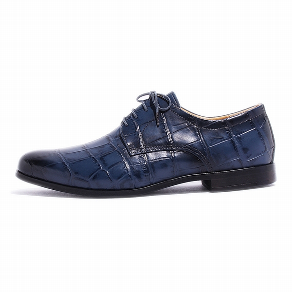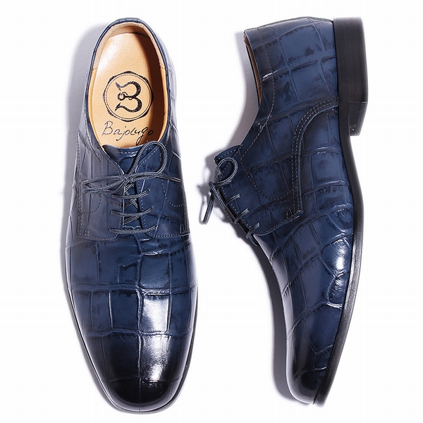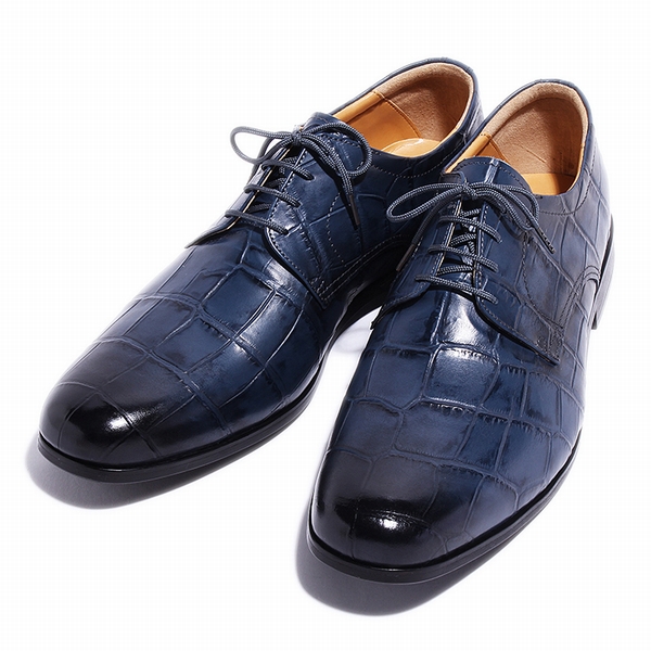 今回ご紹介するのは、BajoLugoイチオシのクロコダイル型押しレザーを、アンティーク仕上げしたシブすぎるレザーシューズをお届けします!トゥ(つま先)に飾りが一切ないのが「プレーントゥシューズ」。どのような場面でも一足で履き回したい人にはおすすめ!ビジネスシーンをはじめ、カジュアルなデニムやスラックスにも非常に合わせやすい。全て手作業で仕上げられた革靴は大人っぽいメンズコーデを演出できます!プレーントゥはどんなファッションにも汎用性のある作りなのが特徴ビジネスシーンをはじめ、カジュアルなデニムやスラックスにも非常に合わせやすい。 色はクロコダイル型押しネイビー アンティーク仕上げ。