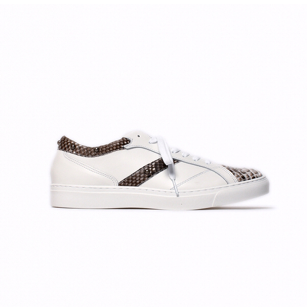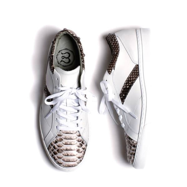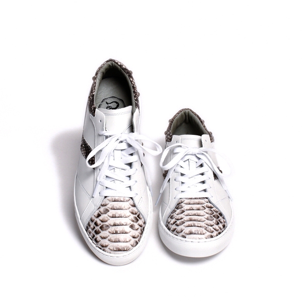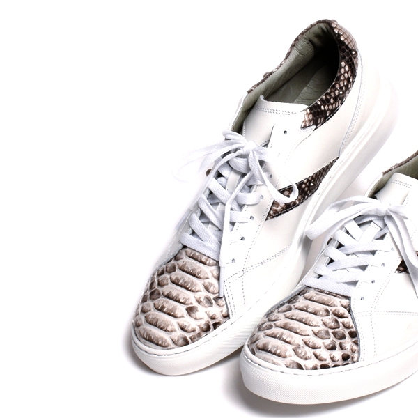 | 今回ご紹介するのは、大人の足元に差別化を図る、本パイソンを使用した最高級のレザースニーカー。マット仕上げ(艶なし)加工されており、独特のウロコが美しくハードな印象をあたえてくれる。パイソンを背割りにし、腹のウロコを活かしたバックカットを使用。インソールにはイタリアを代表する底製造会社である、ウェアライト社の発砲スポンジソールを使用。足の負担を最小限に抑え、