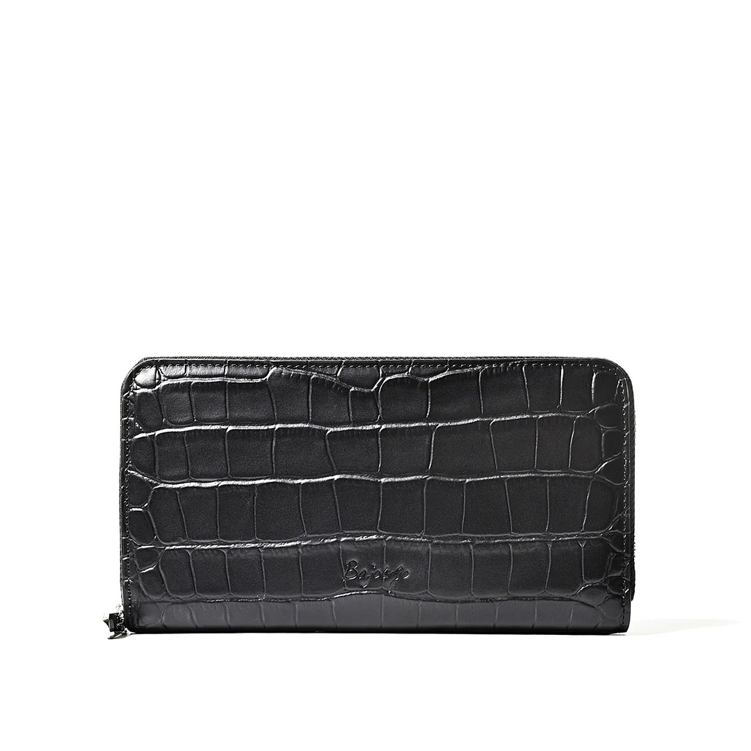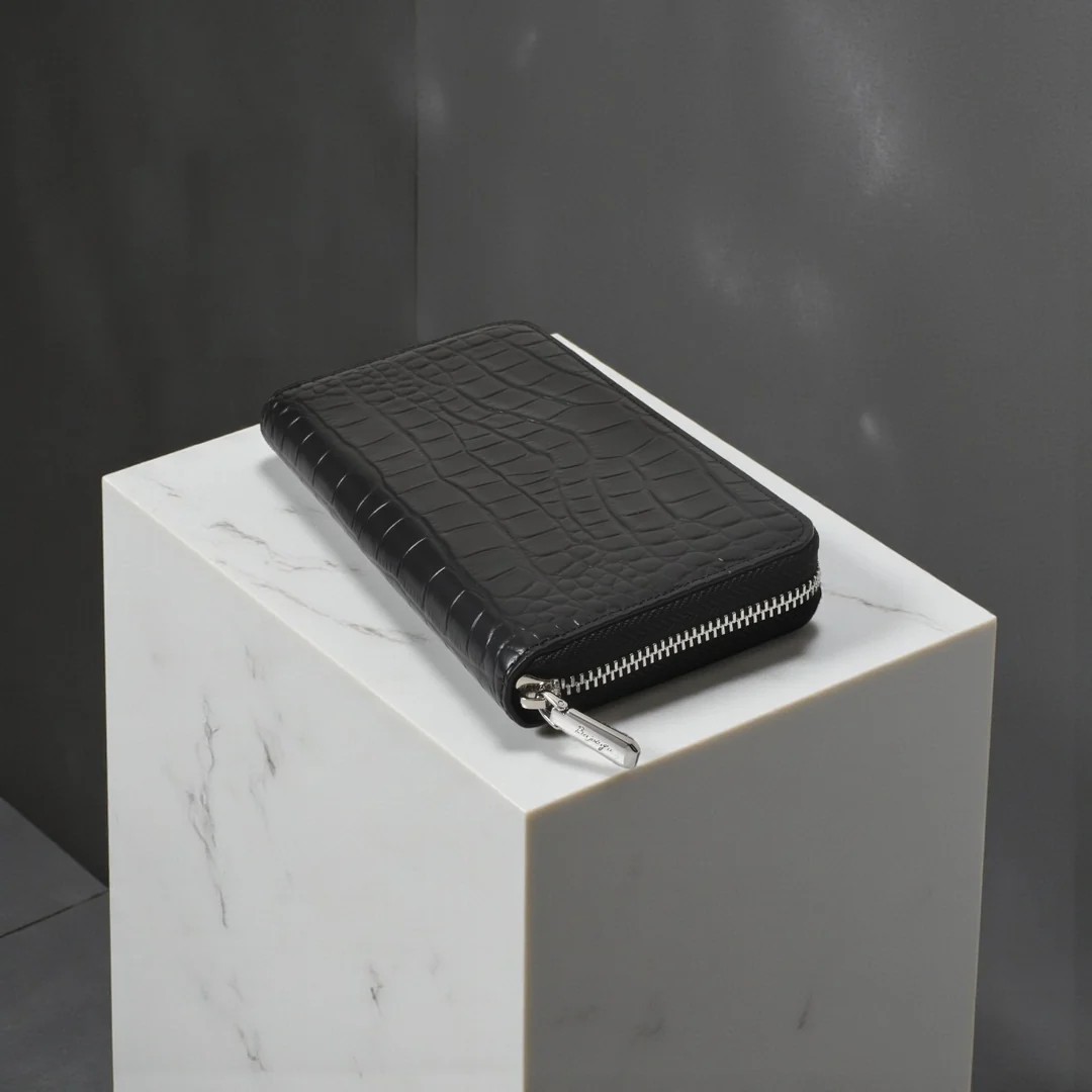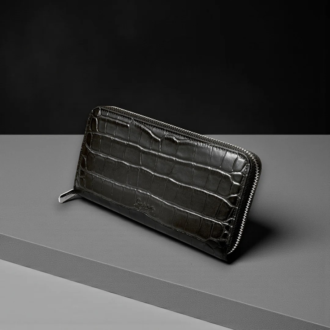 | 今回ご紹介するのは、多数のご要望により待望の「ラウンド財布」が復活。名だたる超一流ブランドの縫製を担う海外トップ工場から逆指名で依頼を受け、縫製は海外で、最終仕上げは日本で行う“ハイブリッド製造”。ステッチ精度、仕立ての張り、手に吸い付くような持ち心地──どれを取っても規格外の完成度です。素材は牛革に迫力あるクロコ型押しを施し、贅沢なセンター取りで模様の流れが美しく均一。カラーはイエロー、トープ、ベイビーブルー、ネイビーブルー、ダークグレー、ブラックの選べる6色展開。内装はオール牛革仕様で、カードポケット8、札入れ2、小銭入れ1、フリーポケット4と収納力も抜群。型崩れしにくいガチっとした設計で長く愛用できる一品です。