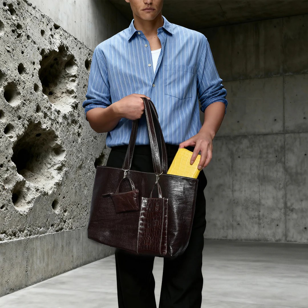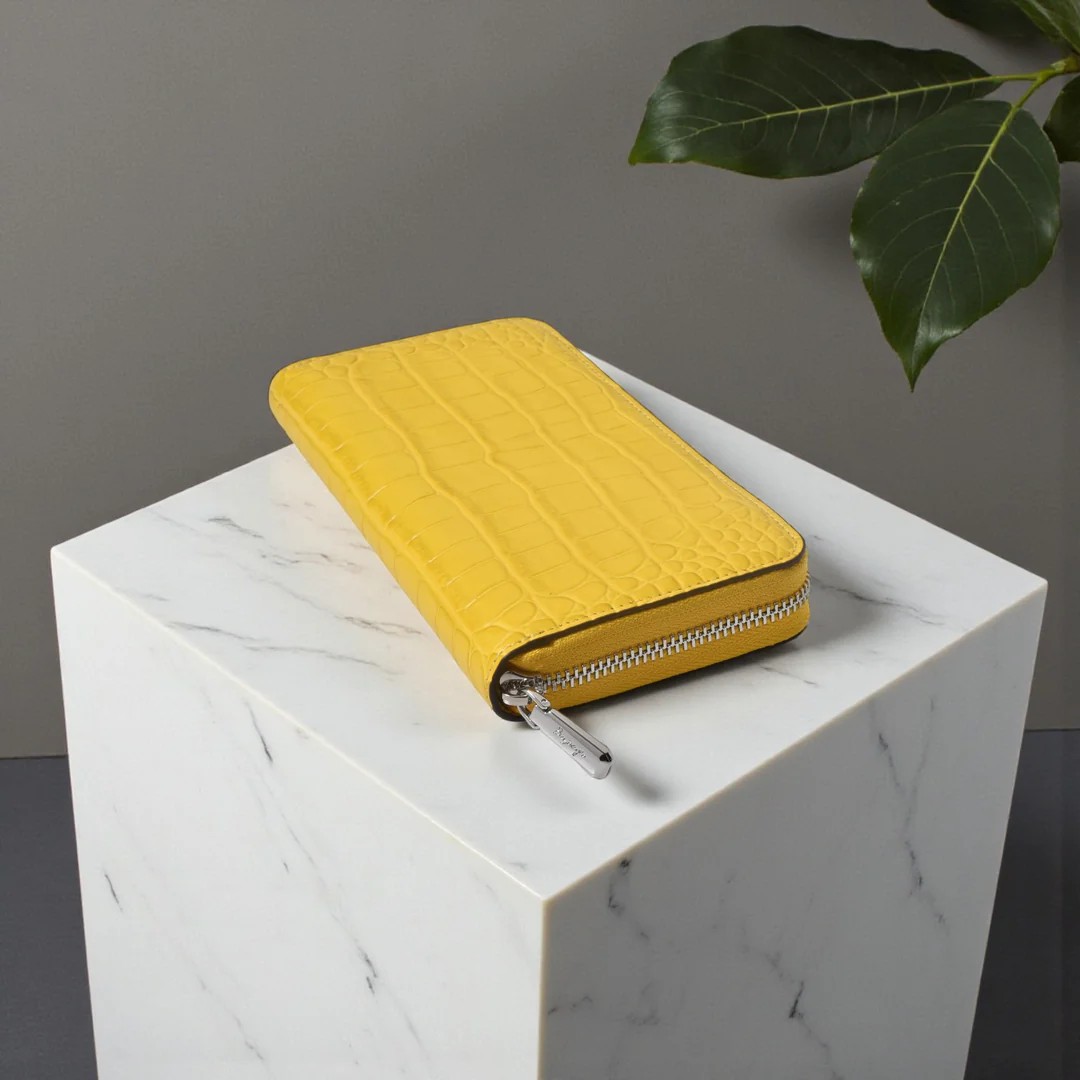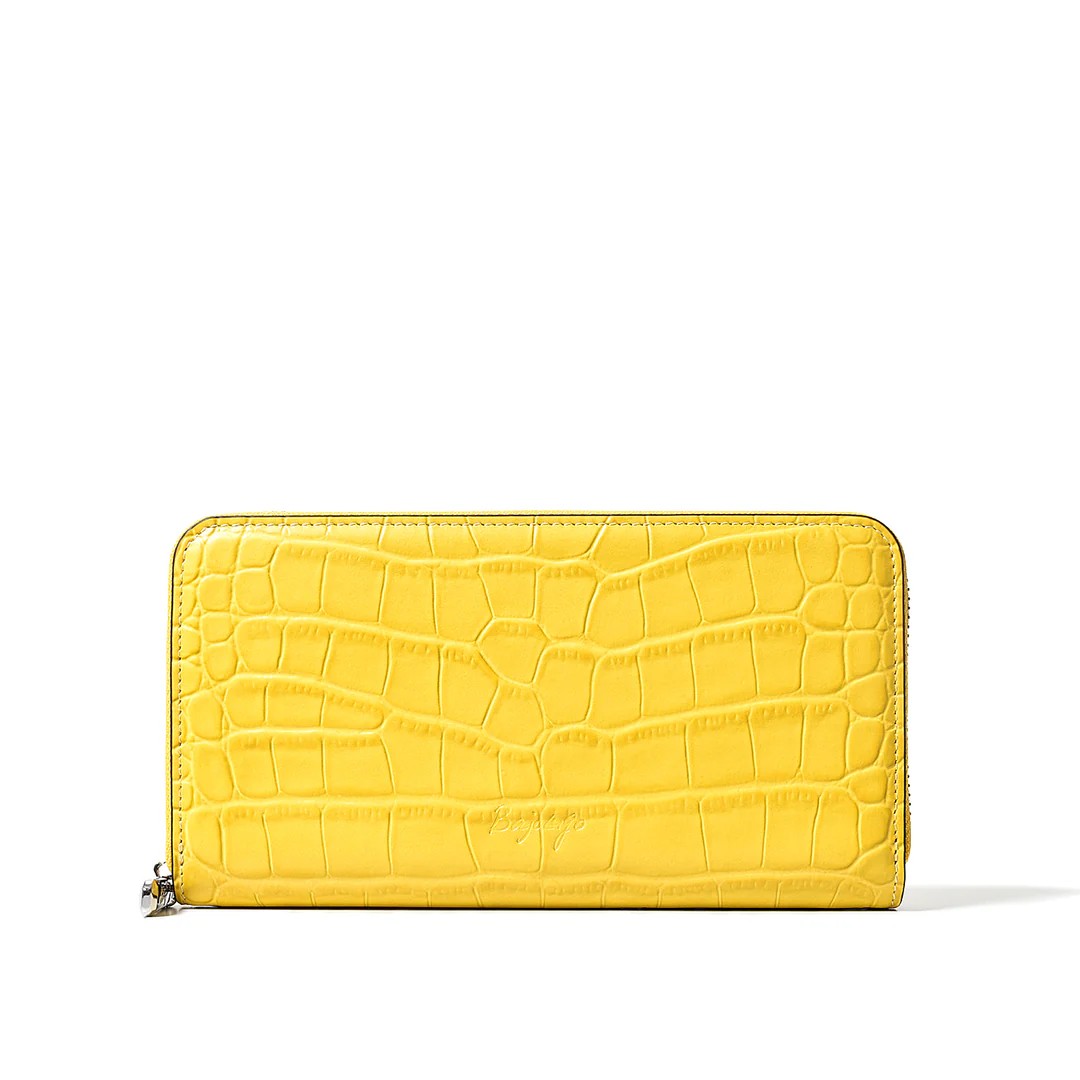 | 今回ご紹介するのは、多数のご要望により待望の「ラウンド財布」が復活。名だたる超一流ブランドの縫製を担う海外トップ工場から逆指名で依頼を受け、縫製は海外で、最終仕上げは日本で行う“ハイブリッド製造”。ステッチ精度、仕立ての張り、手に吸い付くような持ち心地──どれを取っても規格外の完成度です。素材は牛革に迫力あるクロコ型押しを施し、贅沢なセンター取りで模様の流れが美しく均一。カラーはイエロー、トープ、ベイビーブルー、ネイビーブルー、ダークグレー、ブラックの選べる6色展開。内装はオール牛革仕様で、カードポケット8、札入れ2、小銭入れ1、フリーポケット4と収納力も抜群。型崩れしにくいガチっとした設計で長く愛用できる一品です。