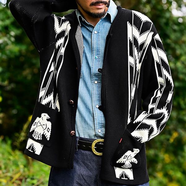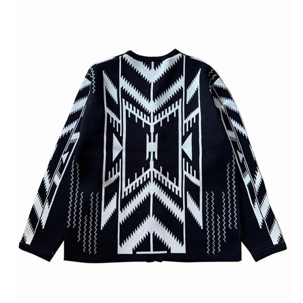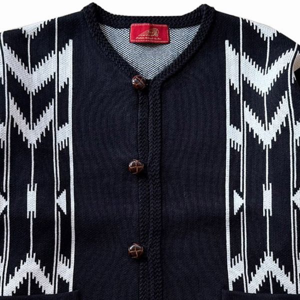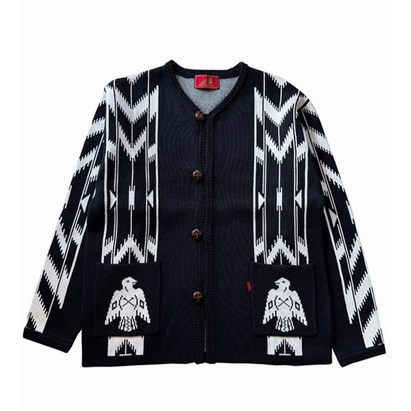 | 今回のモデルは、W-Jacquard Cardigan "Chimayo Stripe"のご紹介です。チマヨの伝統的な柄を、ヴィンテージブランケットをイメージして織り上げたダブルジャカードのニットカーディガン。ポケット部分には、ネイティブアメリカンに伝わる伝説の生物「サンダーバード」をモチーフとして配しました。また、編み地を切り替えたトリミングはデザインのアクセントとなるだけでなく、製品の強度も高めています。ヴィンテージ調のデザインに合わせてバスケットボタンを採用した、細部までこだわりの詰まった一着です。ユニセックス(男女兼用)