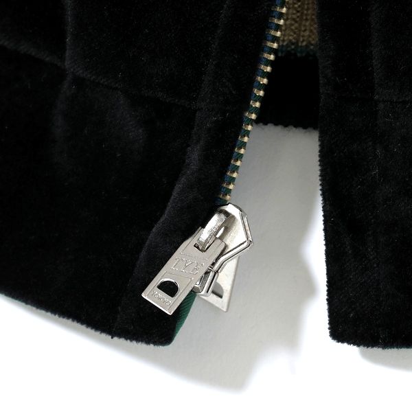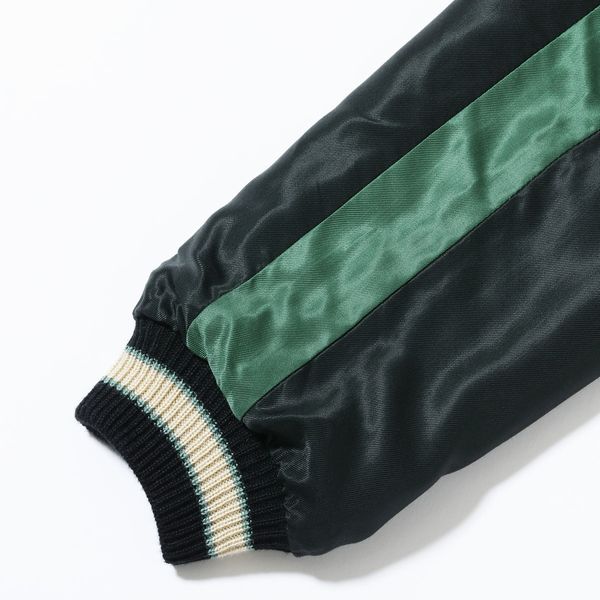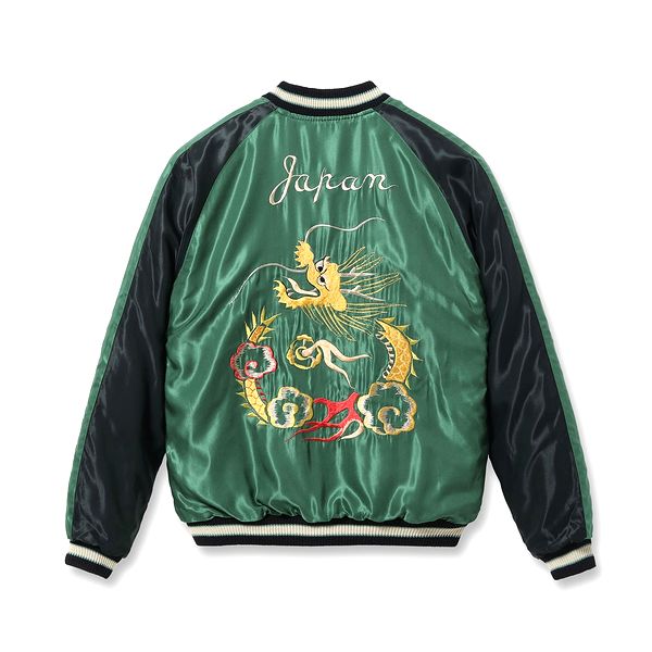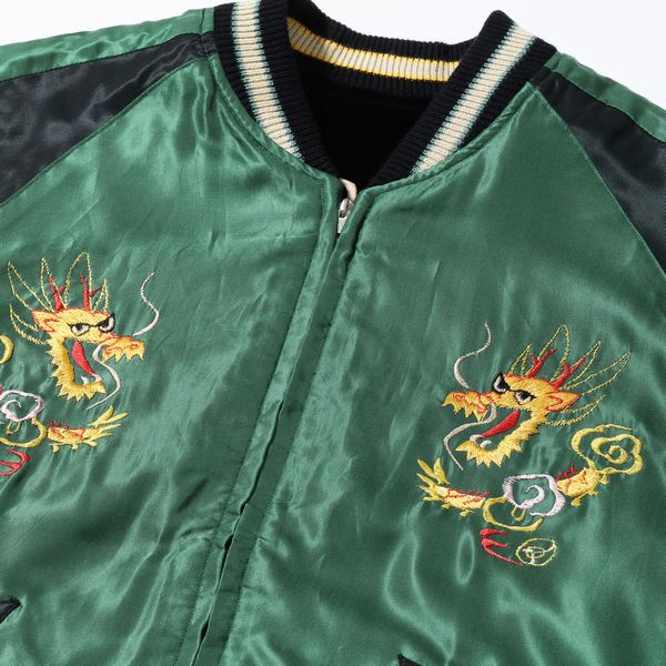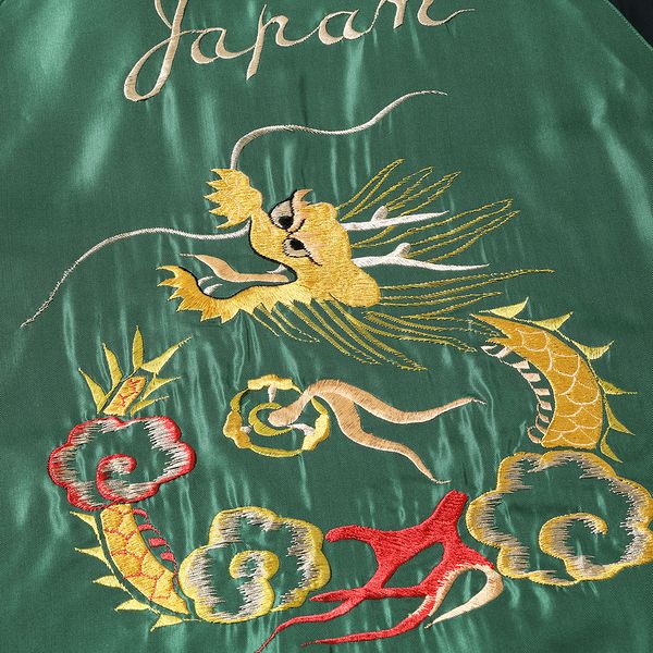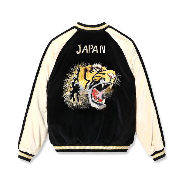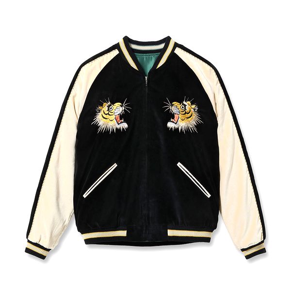 | テーラー東洋は前身の「港商」の時代からスカジャンを作り続け、過去の製品がいまや「ヴィンテージ」として評価されている。ヴィンテージではウルトラレアと言っても過言ではない別珍2トーンのモデルを新たに展開。サテンのスカジャンと同じように身頃と袖下の色を切り替えているが、仕上がりは全くの別物であり、ただならぬ存在感を醸し出している。刺繍は1950年代中期の作品をもとに、虎の顔を細部まで緻密に表現した「タイガーヘッド」と呼ばれる人気の絵柄。頬の毛や鬣は針足を何度も変えながら一本一本繊細に描かれており、優れた職人の手掛けた刺繍であることがわかる。リバーシブル面は、身頃より袖下の色の方が濃い「逆配色」。グリーン×ブラックのダークトーンのボディには、金龍に使われているイエローや淡いピンクの色糸が映える。