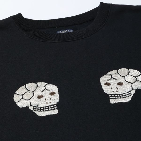 | 今回のモデルは、ヴィンテージでは現存する数が極めて少なく、群を抜いて希少価値の高い髑髏柄を今季はスウェットシャツでリリース。貴重なヴィンテージをもとに、デザインだけでなく刺繍の針足(運針)まで再現している。ボディは裏起毛のため保温性にも優れた仕上がりで、手軽に髑髏柄を味わえる点も魅力のひとつ。