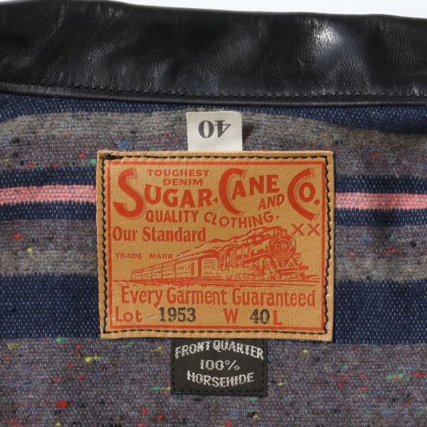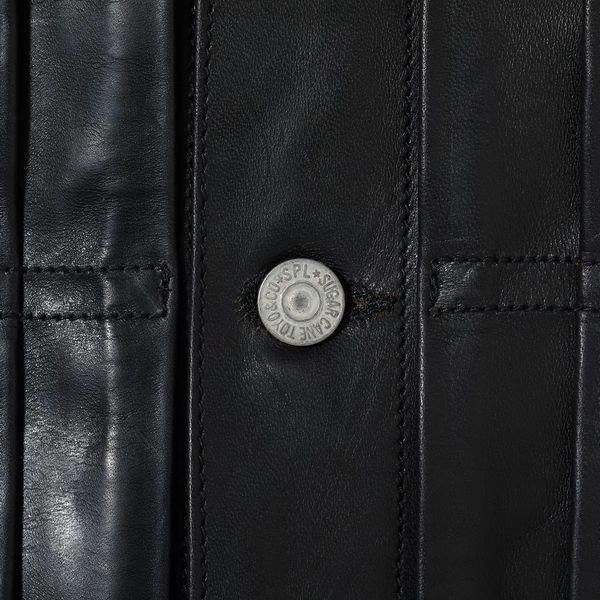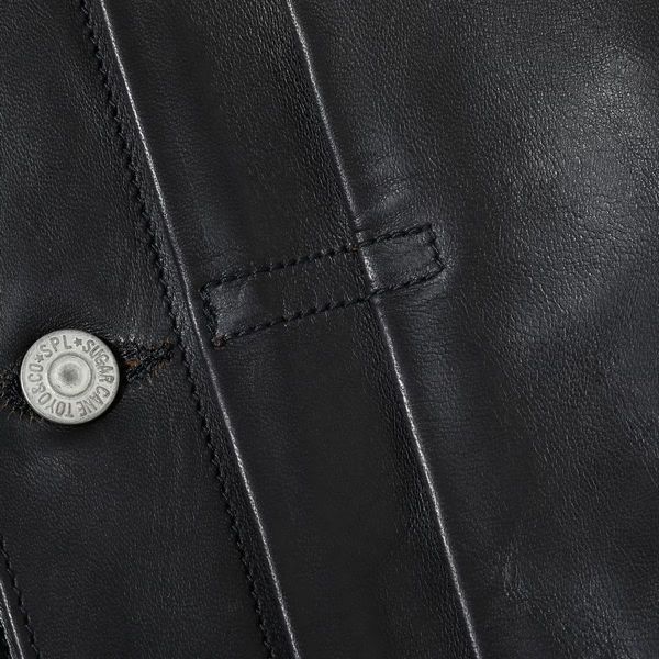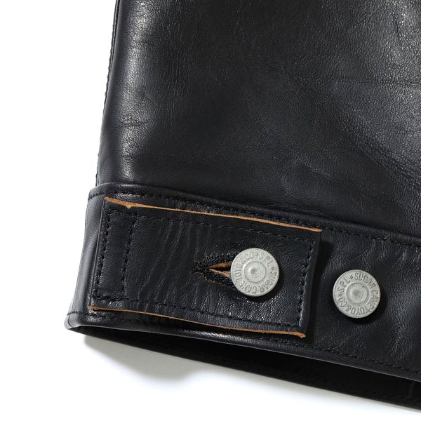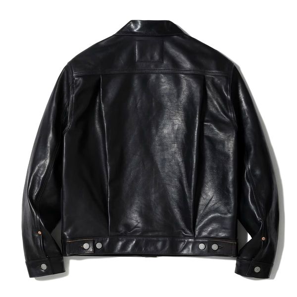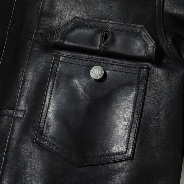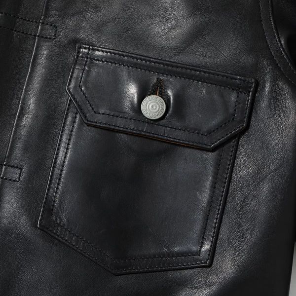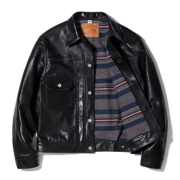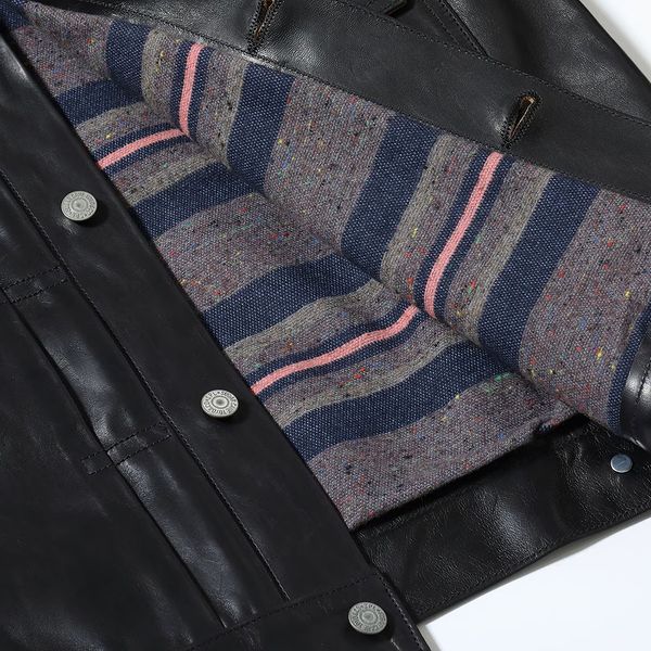 | 今回のモデルは、1.1mm厚のホースハイドレザー製1953モデル。渋鞣しされたブラウンレザーにブラックのアニリン染料を何度も重ね塗りすることで深みのある色味になっている。さらにワックス加工も施しているので耐水性があり、独特の光沢や経年変化に期待できる。ホースハイドは28インチ幅のデニムよりも裁断に制限が無いため、サイズ42インチ以上も後身頃に脇の接ぎがないのが特徴。裏地には保温性のあるボーダーブランケットを使用している。