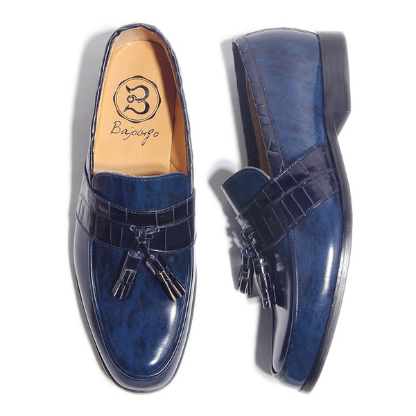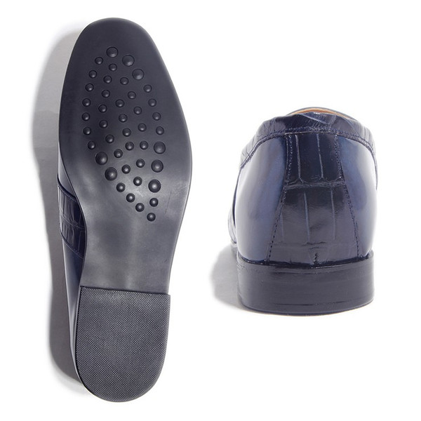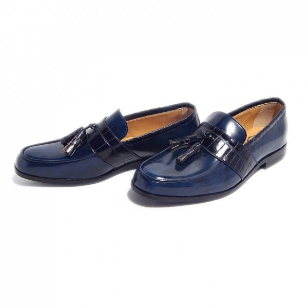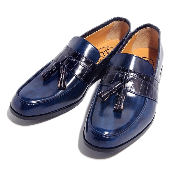 | 今回ご紹介するのは、しっかりした厚みのあるレザーにムラ染めされた表面は、みて分かるとおり大人の雰囲気を抜群に醸し出す。足元に存在感を与えてくれるタッセルは、毎日手が伸びそうなヘビロテアイテムで間違いなし!色はムラ染めレザーネイビー×クロコダイル型押しネイビー。パーティーシーンに持ち出してもOK! | ||||||||||||||||||||||||||||||||||||