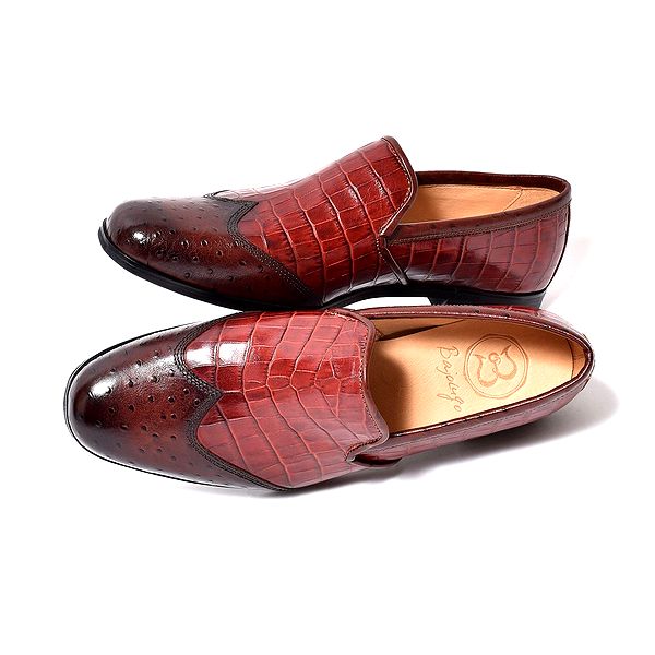 | 今回ご紹介するのは、一味も二味もあるウィングチップのスリッポン。クロコダイル&オーストリッチの模様を型押しした国産天然牛革を使用。相違した模様を茶系で揃える事で見事に統一感を持たせた。そんなエンボスレザーを纏ったスリッポンは、パーティーシーンなどでも活躍できる華やかでゴージャスな面持ち。また、職人の手作業で専用クリームを何層にも塗り重ね、アンティーク仕上げを施し色の深みと高級感も兼ね備えた。見た目はフォーマルだが高いクッション性を誇り、長時間歩いても足に負担を掛けないシューズだ。インソールには低反発クッションスポンジ、アウトソールにはラバーソールを採用する事で柔らかな履き心地を実現。フォーマルな革靴にはレザーソールと言う概念が定着されているが、BajoLugoはその革底にあるフォーマル加減を残しつつも履き心地にも重点を置いた。また、木型にもこだわり日本人の足型に馴染むように設計。見た目だけでなく、中身にも重きを置いた革靴だ。