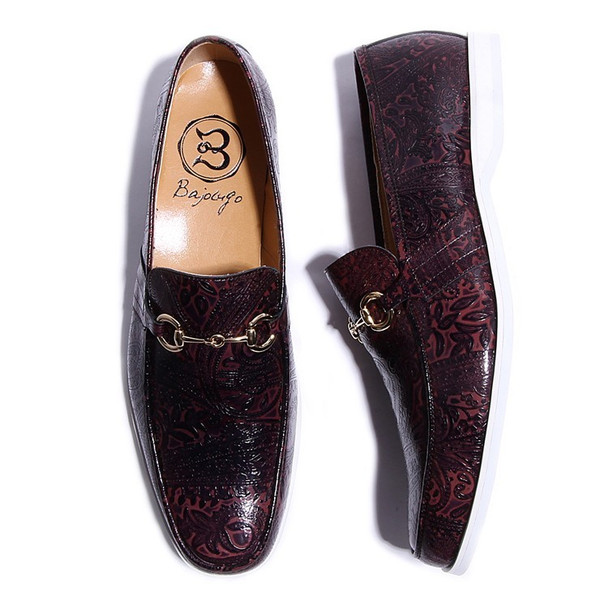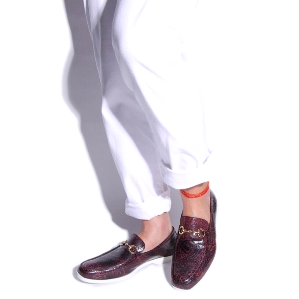今注目のレザーシューズブランド“BajoLugo”。今回ご紹介するのは、ペイズリー柄を用いるだけでグッとオシャレ度UP。アンティークゴールドビットとのコンビネーションがいつもより雰囲気のあるスタイリングに。 色はパープル。ローファーの持つ品の良さはしっかりキープしている。