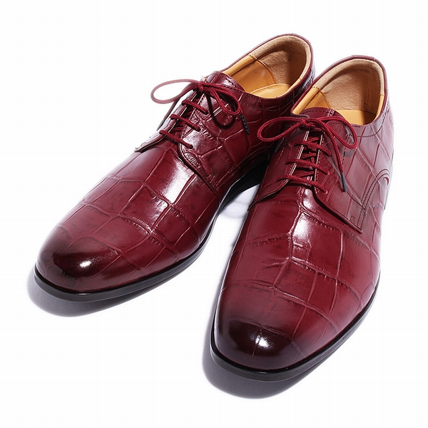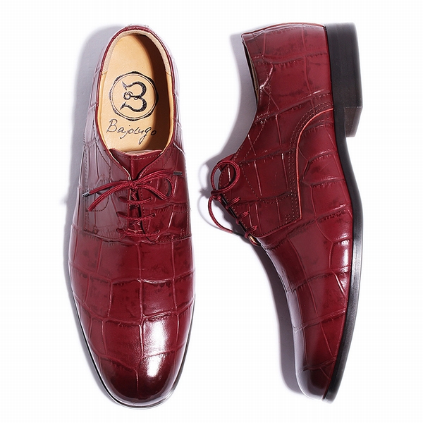 今回ご紹介するのは、BajoLugoイチオシのクロコダイル型押しレザーを、アンティーク仕上げしたシブすぎるレザーシューズをお届けします!トゥ(つま先)に飾りが一切ないのが「プレーントゥシューズ」。どのような場面でも一足で履き回したい人にはおすすめ!ビジネスシーンをはじめ、カジュアルなデニムやスラックスにも非常に合わせやすい。全て手作業で仕上げられた革靴は大人っぽいメンズコーデを演出できます!プレーントゥはどんなファッションにも汎用性のある作りなのが特徴ビジネスシーンをはじめ、カジュアルなデニムやスラックスにも非常に合わせやすい。 色はクロコダイル型押しワイン アンティーク仕上げ。