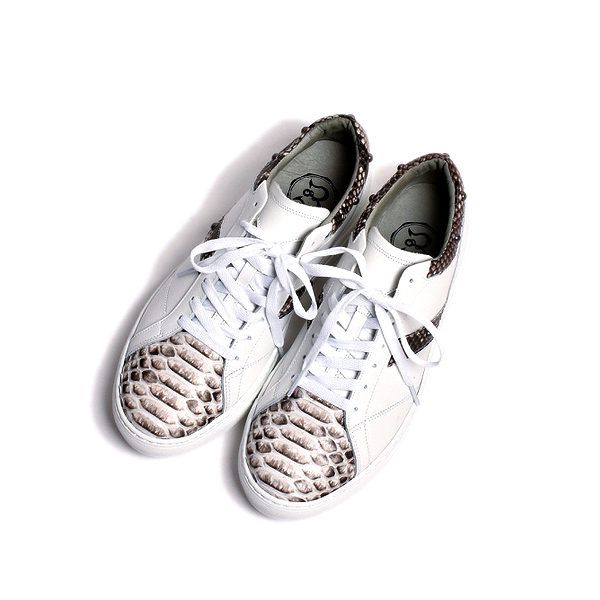 | 今回ご紹介するのは、大人の足元に差別化を図る、本パイソンを使用した最高級のレザースニーカー。マット仕上げ(艶なし)加工されており、独特のウロコが美しくハードな印象をあたえてくれる。パイソンを背割りにし、腹のウロコを活かしたバックカットを使用。インソールにはイタリアを代表する底製造会社である、ウェアライト社の発砲スポンジソールを使用。足の負担を最小限に抑え、