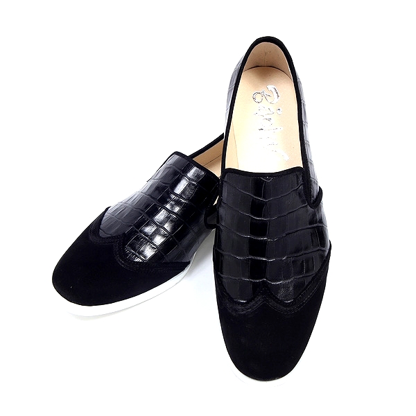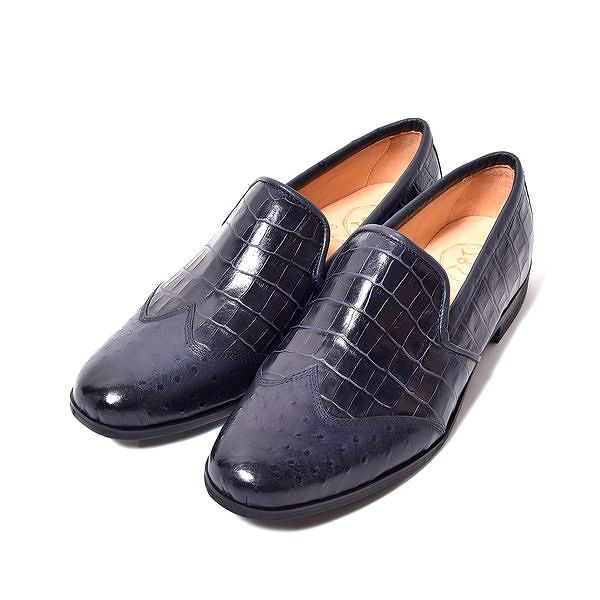 【BajoLugo/バジョルゴ】 ウィングチップ スリッポン アンティーク ネイビー クロコ 型押し × オーストリッチ 型押し