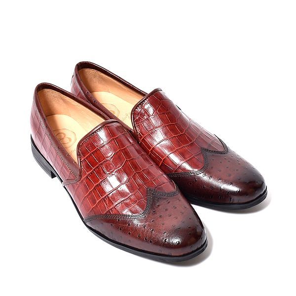 【BajoLugo/バジョルゴ】 ウィングチップ スリッポン アンティークブラウン クロコ 型押し × オーストリッチ 型押し