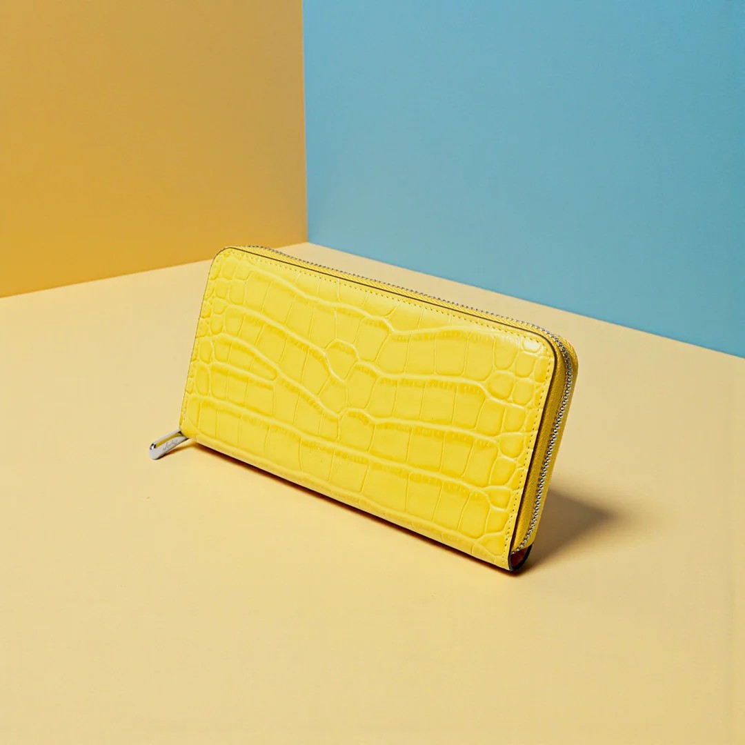 | 今回ご紹介するのは、多数のご要望により待望の「ラウンド財布」が復活。名だたる超一流ブランドの縫製を担う海外トップ工場から逆指名で依頼を受け、縫製は海外で、最終仕上げは日本で行う“ハイブリッド製造”。ステッチ精度、仕立ての張り、手に吸い付くような持ち心地──どれを取っても規格外の完成度です。素材は牛革に迫力あるクロコ型押しを施し、贅沢なセンター取りで模様の流れが美しく均一。カラーはイエロー、トープ、ベイビーブルー、ネイビーブルー、ダークグレー、ブラックの選べる6色展開。内装はオール牛革仕様で、カードポケット8、札入れ2、小銭入れ1、フリーポケット4と収納力も抜群。型崩れしにくいガチっとした設計で長く愛用できる一品です。