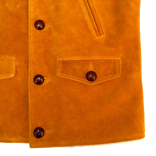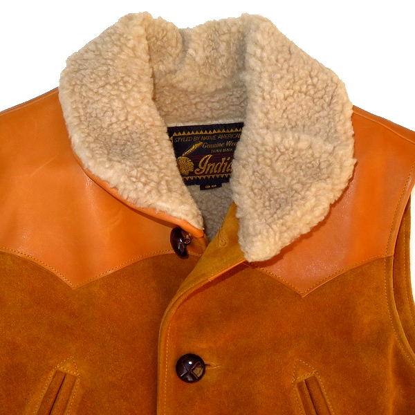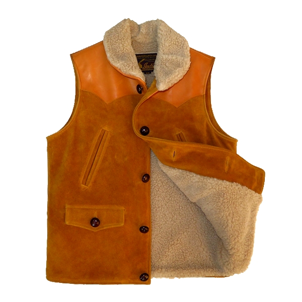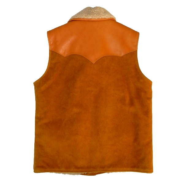 | 今回のモデルは、スウェード素材で雰囲気抜群なCOW SPLITランチベストになります。 襟、インナー共にボアを使用することで防寒性も完備された、とても暖かいランチベストです。デザインは両胸、背中にはウエスタンヨーク仕様でボディーのスウェードに対して、ヨーク部分は表革を使うなどさすがのデザイン!!ボタンはクルミボタンになります。