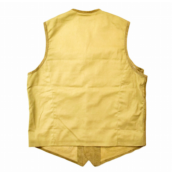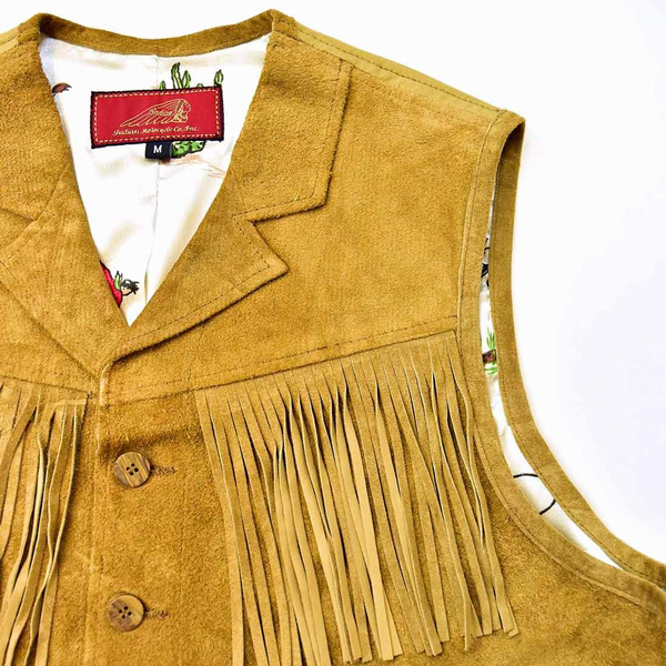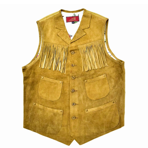 | 今回のモデルは、カウスウェードで仕立てたフリンジ付きのウェスタンベスト。大人のネイティブアメリカンMIXスタイルに是非取り入れてほしいオススメのアイテムです。インナーとして着用の際にネックラインがスッキリするようにカラー&ラペルはフロントのみでバックスタイルはシンプルに仕上げています。デニムやネルシャツ、スウェットシャツとの相性も良くアウターのメインアイテムとしても存在感があります。決して派手すぎない計算されたフリンジ&ポケットのバランス。
