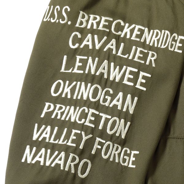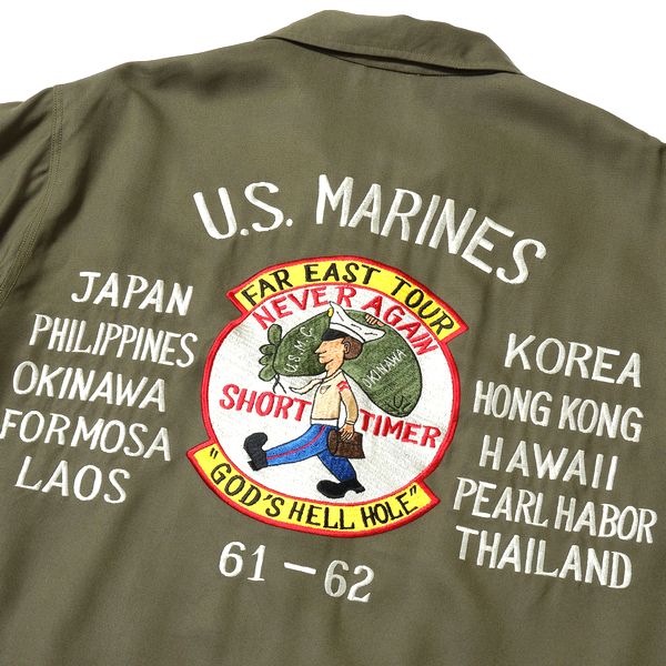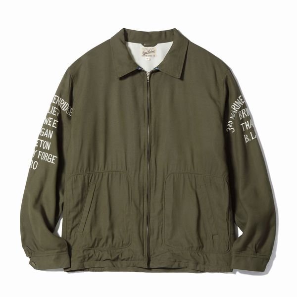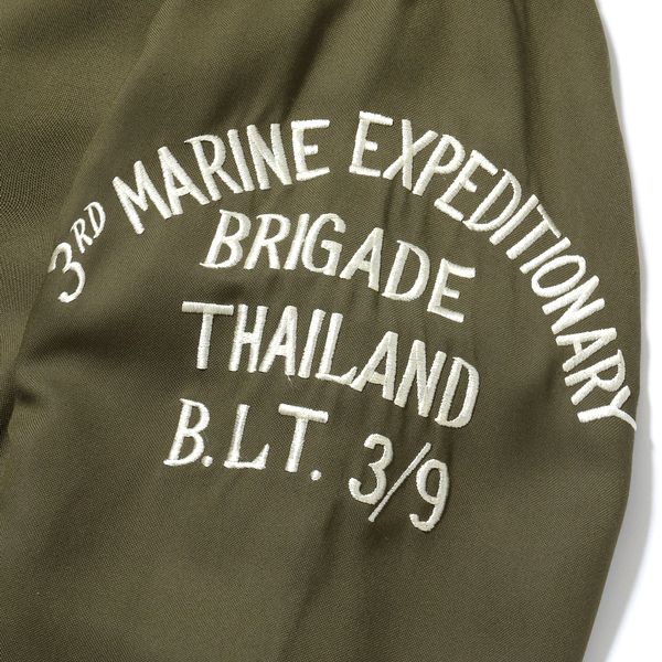| 今回のモデルは東洋エンタープライズが手がけるブランド、バズリクソンズ BUZZ RICKSON'Sから太番手の糸を用いたレーヨンオックスフォード地のツアージャケットに施された刺繍はアメリカ海兵隊の第3海兵遠征軍に所属する兵士が当時、個人レベルで製作したスペシャルオーダーものである。第3海兵遠征軍は太平洋地域で不測の事態に対応すべく、米国の国家安全保障を支援するため1942年に設立された歴史ある部隊。この部隊の基地は沖縄のキャンプ・コートニーにあるため、当時は沖縄の米軍基地周辺に構える刺繍店で製作された。右袖にはこれまで乗艦した兵員輸送艦や攻撃輸送艦、背面には航海した先々の地域が所狭しと刺繍され、着用者の兵士がどれ程の激務を遂行してきたかを表している。兵士が遺体袋を担ぎながら、『もう二度と味わいたくない神の地獄穴』と、戦争と任務を皮肉った兵士のやるせない思いがこの一着から伝わってくる。