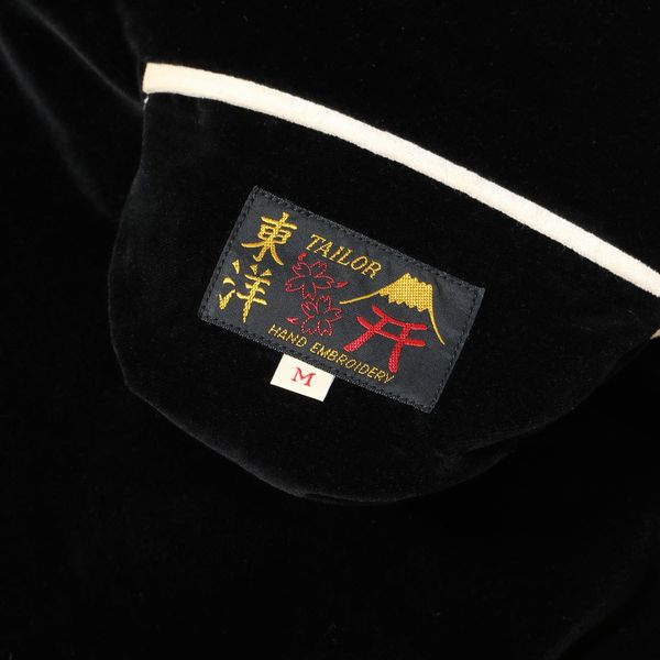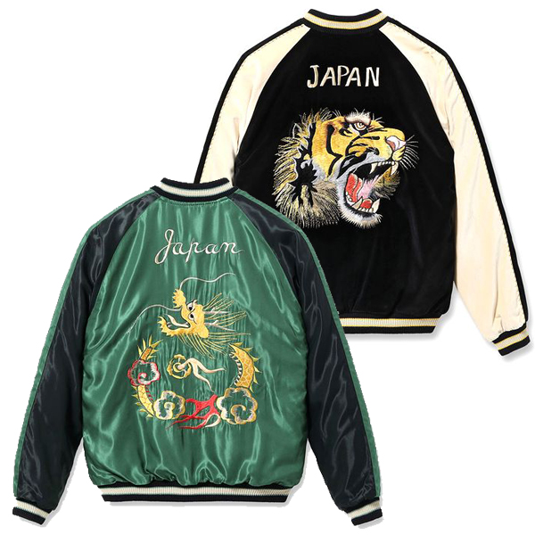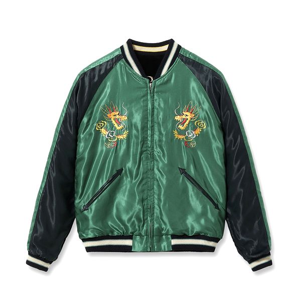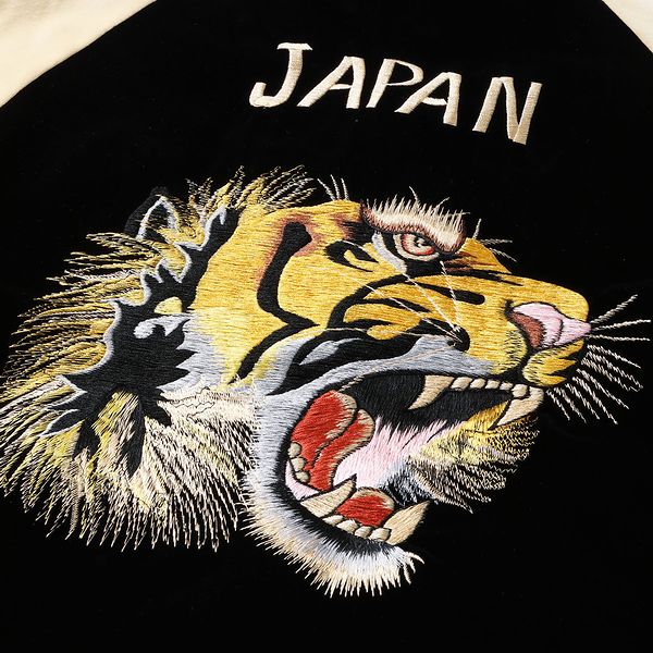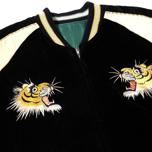 | テーラー東洋は前身の「港商」の時代からスカジャンを作り続け、過去の製品がいまや「ヴィンテージ」として評価されている。ヴィンテージではウルトラレアと言っても過言ではない別珍2トーンのモデルを新たに展開。サテンのスカジャンと同じように身頃と袖下の色を切り替えているが、仕上がりは全くの別物であり、ただならぬ存在感を醸し出している。刺繍は1950年代中期の作品をもとに、虎の顔を細部まで緻密に表現した「タイガーヘッド」と呼ばれる人気の絵柄。頬の毛や鬣は針足を何度も変えながら一本一本繊細に描かれており、優れた職人の手掛けた刺繍であることがわかる。リバーシブル面は、身頃より袖下の色の方が濃い「逆配色」。グリーン×ブラックのダークトーンのボディには、金龍に使われているイエローや淡いピンクの色糸が映える。