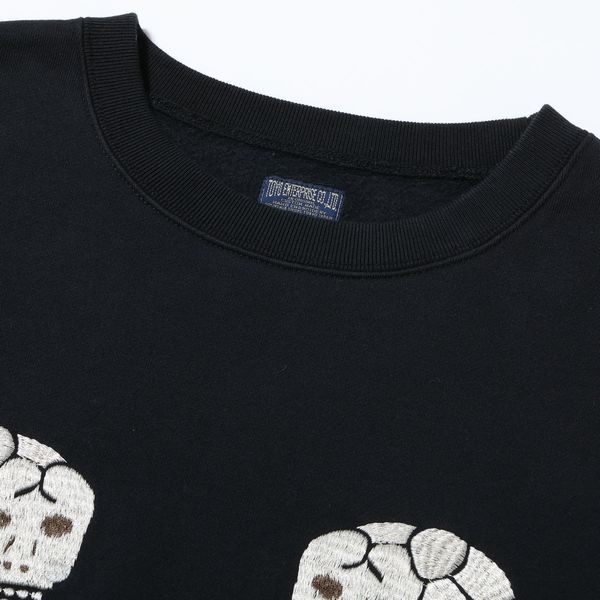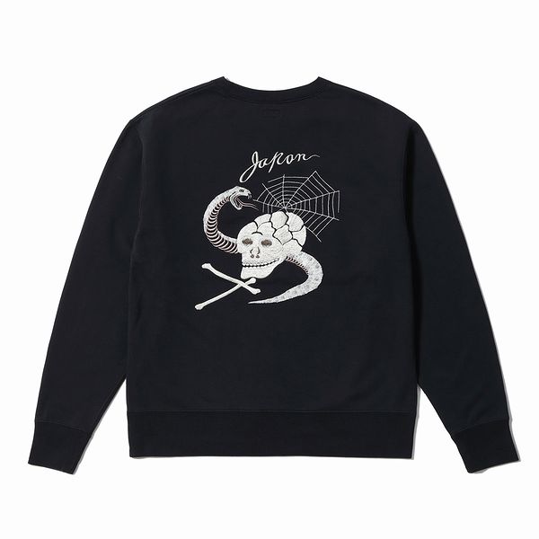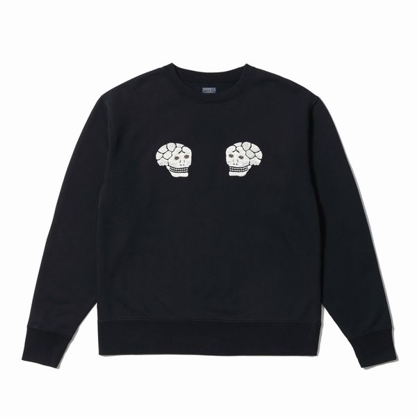 | 今回のモデルは、ヴィンテージでは現存する数が極めて少なく、群を抜いて希少価値の高い髑髏柄を今季はスウェットシャツでリリース。貴重なヴィンテージをもとに、デザインだけでなく刺繍の針足(運針)まで再現している。ボディは裏起毛のため保温性にも優れた仕上がりで、手軽に髑髏柄を味わえる点も魅力のひとつ。