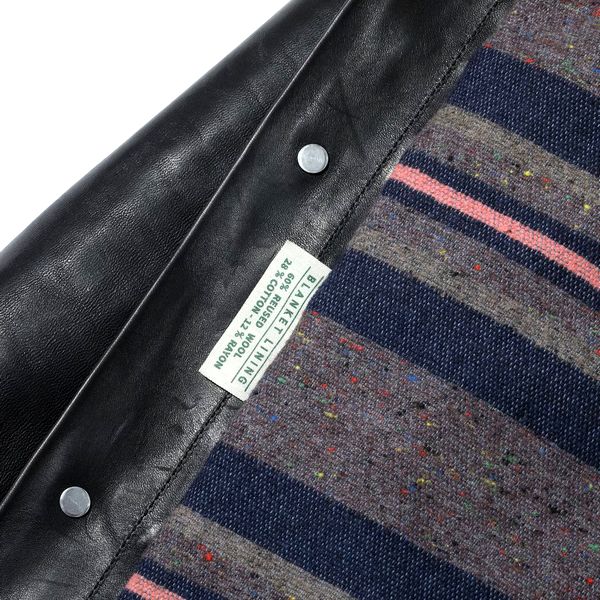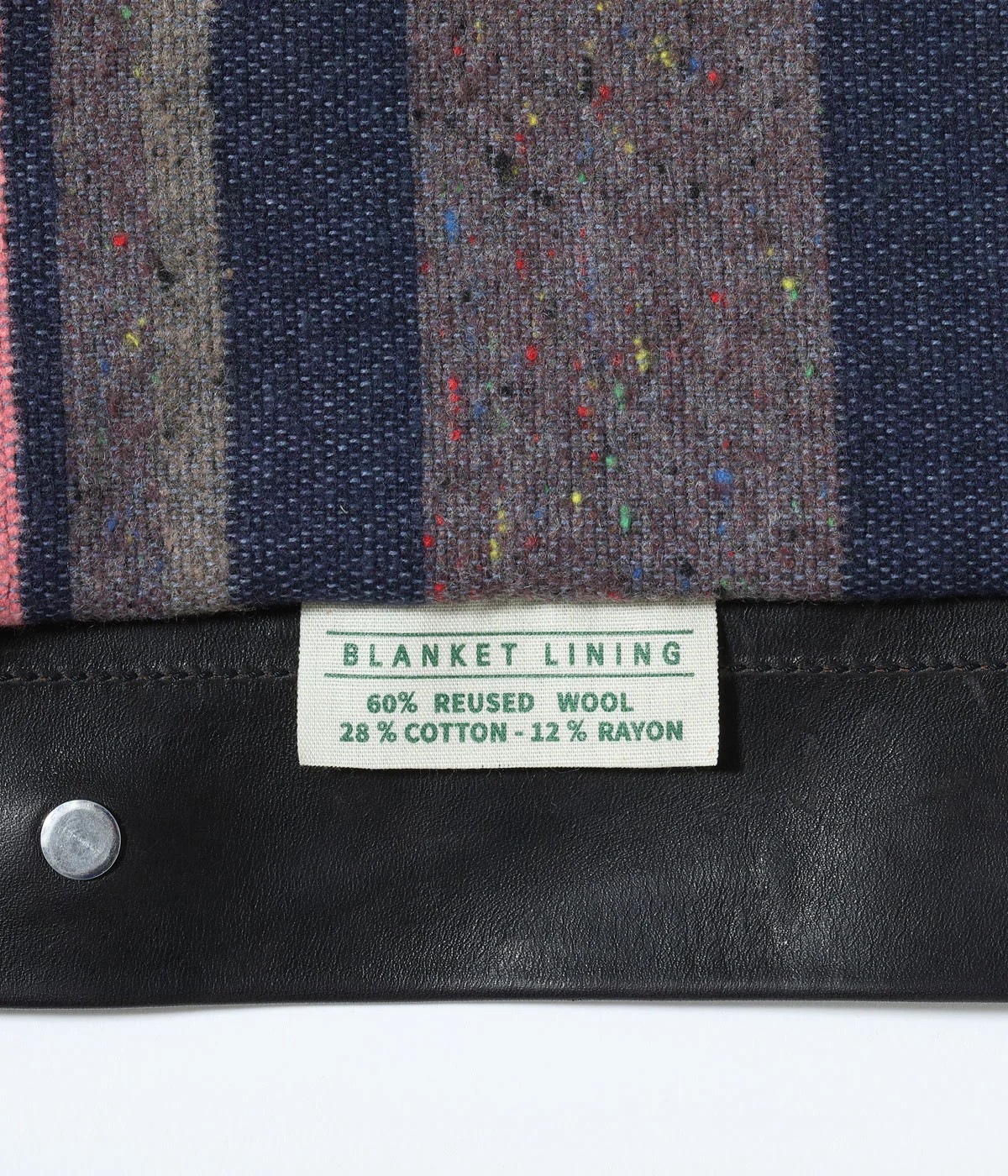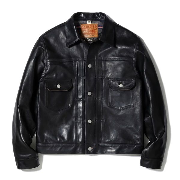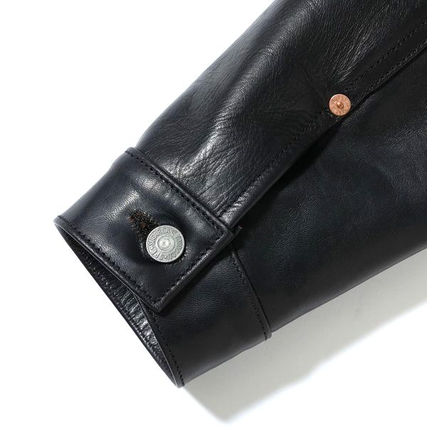 | 今回のモデルは、1.1mm厚のホースハイドレザー製1953モデル。渋鞣しされたブラウンレザーにブラックのアニリン染料を何度も重ね塗りすることで深みのある色味になっている。さらにワックス加工も施しているので耐水性があり、独特の光沢や経年変化に期待できる。ホースハイドは28インチ幅のデニムよりも裁断に制限が無いため、サイズ42インチ以上も後身頃に脇の接ぎがないのが特徴。裏地には保温性のあるボーダーブランケットを使用している。