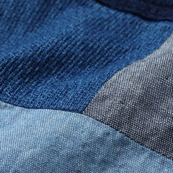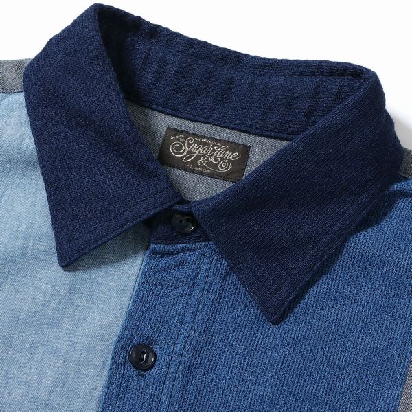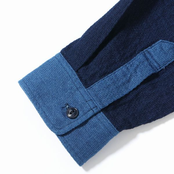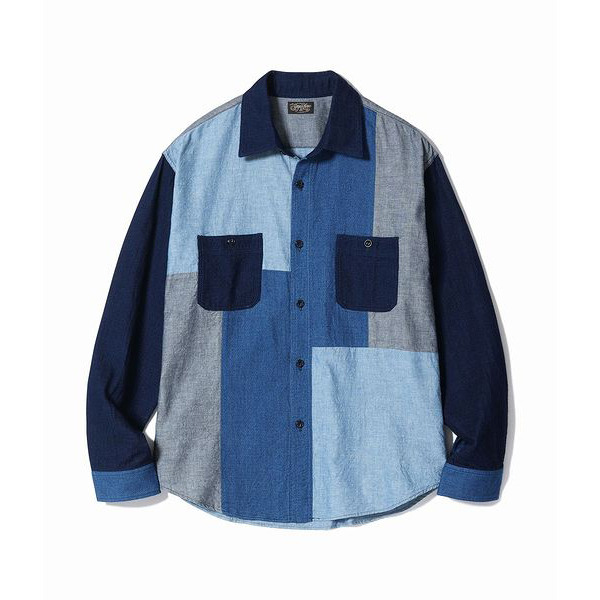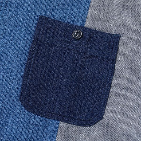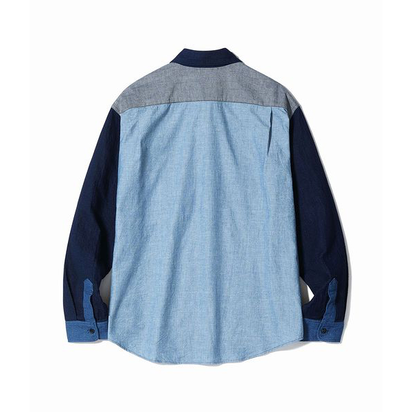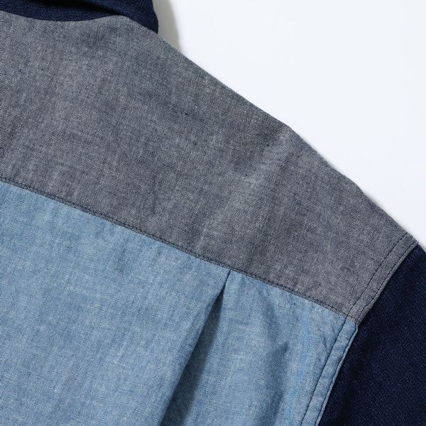 | 今回のモデルは大胆にも前身頃に切り替えを施したワークシャツは、2色のインディゴシャンブレー生地と2色のドビークロスを掛け合わせたアイテム。全てがインディゴ素材であるため着用による経年変化も楽しめる。肩幅や身幅を広めに設定したルーズシルエットのワークシャツは、Add